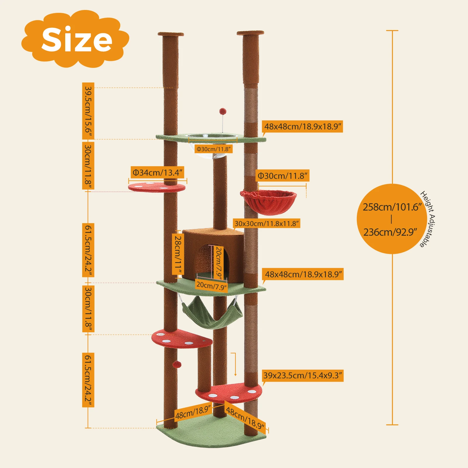Adjustable Height Tall Cat Tree with Sisal Scratching Posts Spacious Condo Large Hammock Multi-Level Cat Tower Cat Accessories