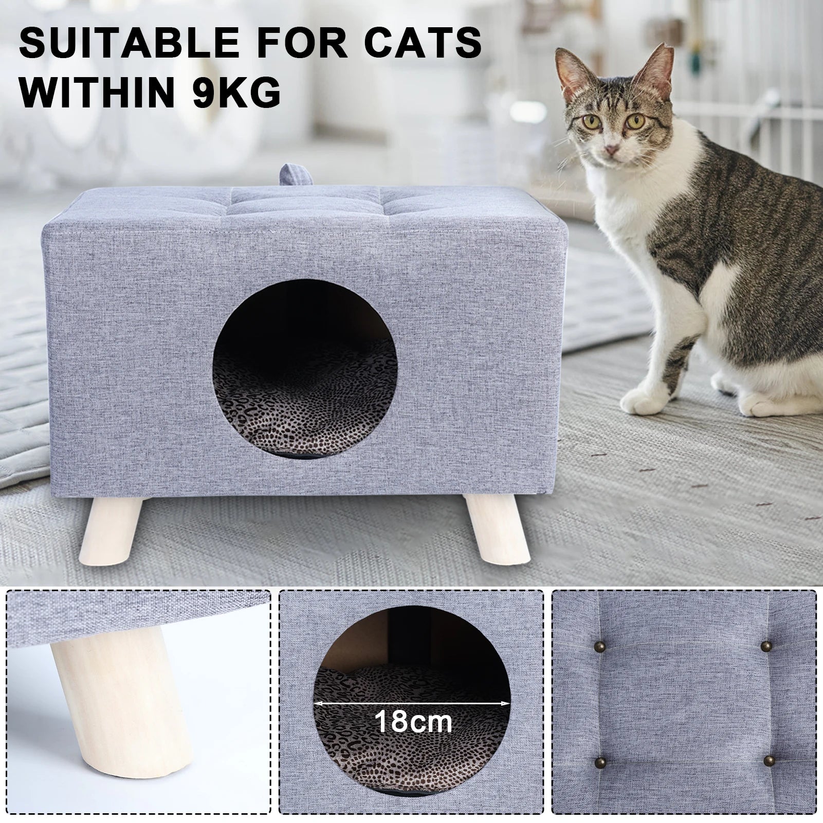 Cat Cube with Wooden Feet: Feet are made of solid wood, sturdy and stable, keep the bottom of the cat house away from dirt, and also keep your cat dry and comfortable.
