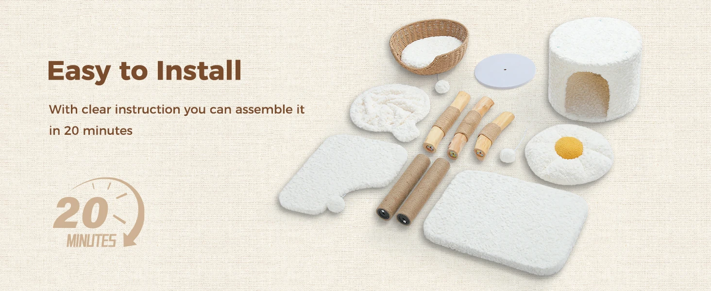 Easy to Install and Nice Looking: This modern cat tree is easy to set up with clear instructions and all hardware. First-timers assemble quickly, no complex tools. Its attractive design—clean lines, white color, flower bed—fits any room, blending style with a perfect cat playground.