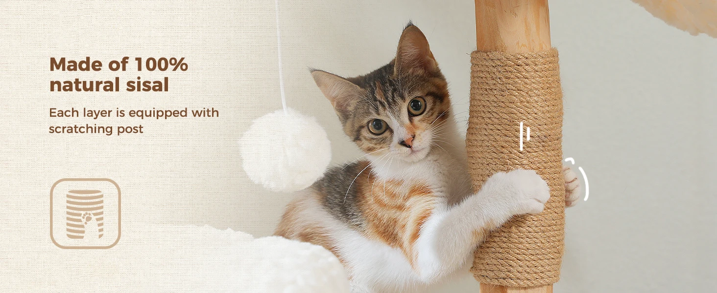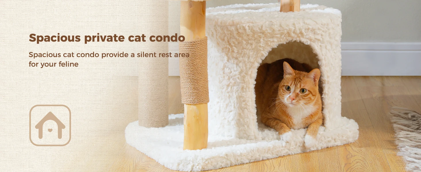 Premium Material and Sturdy Structure: Crafted from high-quality natural wood, this solid wood cat tower durably supports large and adult cats. Its robust frame and real double basement stay stable during energetic play, no wobbles or tipping. An anti toppling strap adds another 50% stability for the whole tree.
