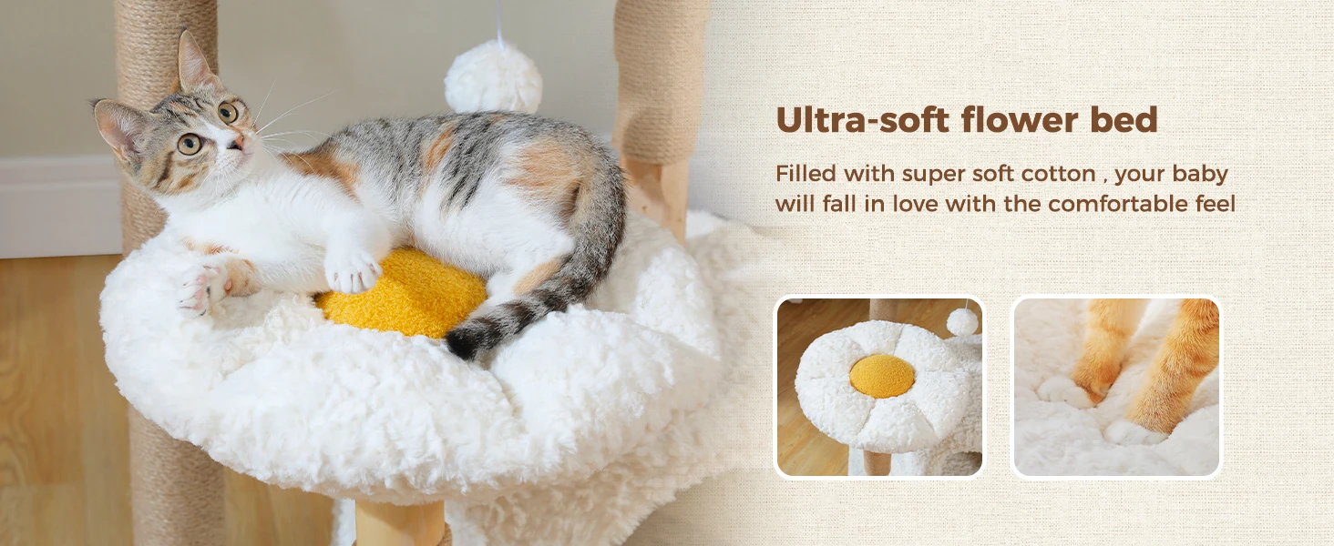 Deluxe and Designer Type: This cat tree blends luxury and modern design, a stylish decor addition. The unique flower cat bed adds elegance, with a sleek white finish complementing contemporary interiors. As a premium luxury cat tree, it’s more than a pet accessory—elevating your space for owners valuing aesthetics and functionality.