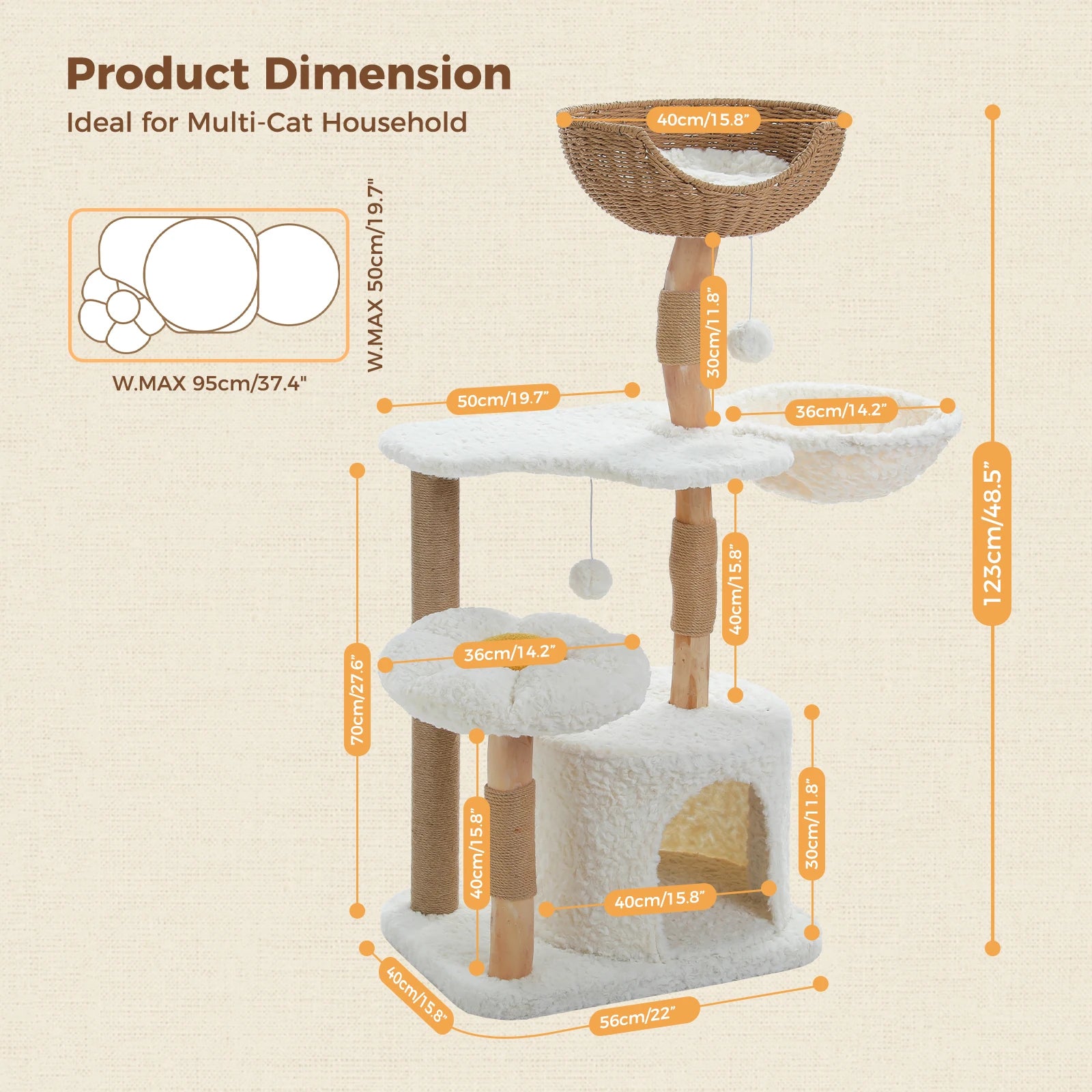 Modern Cat Tree for Indoor Cats Solid Wood Cat Tower with Luxury Cat Condo Cozy Hammock Scratching Post Flower Cat Bed for Large Cats