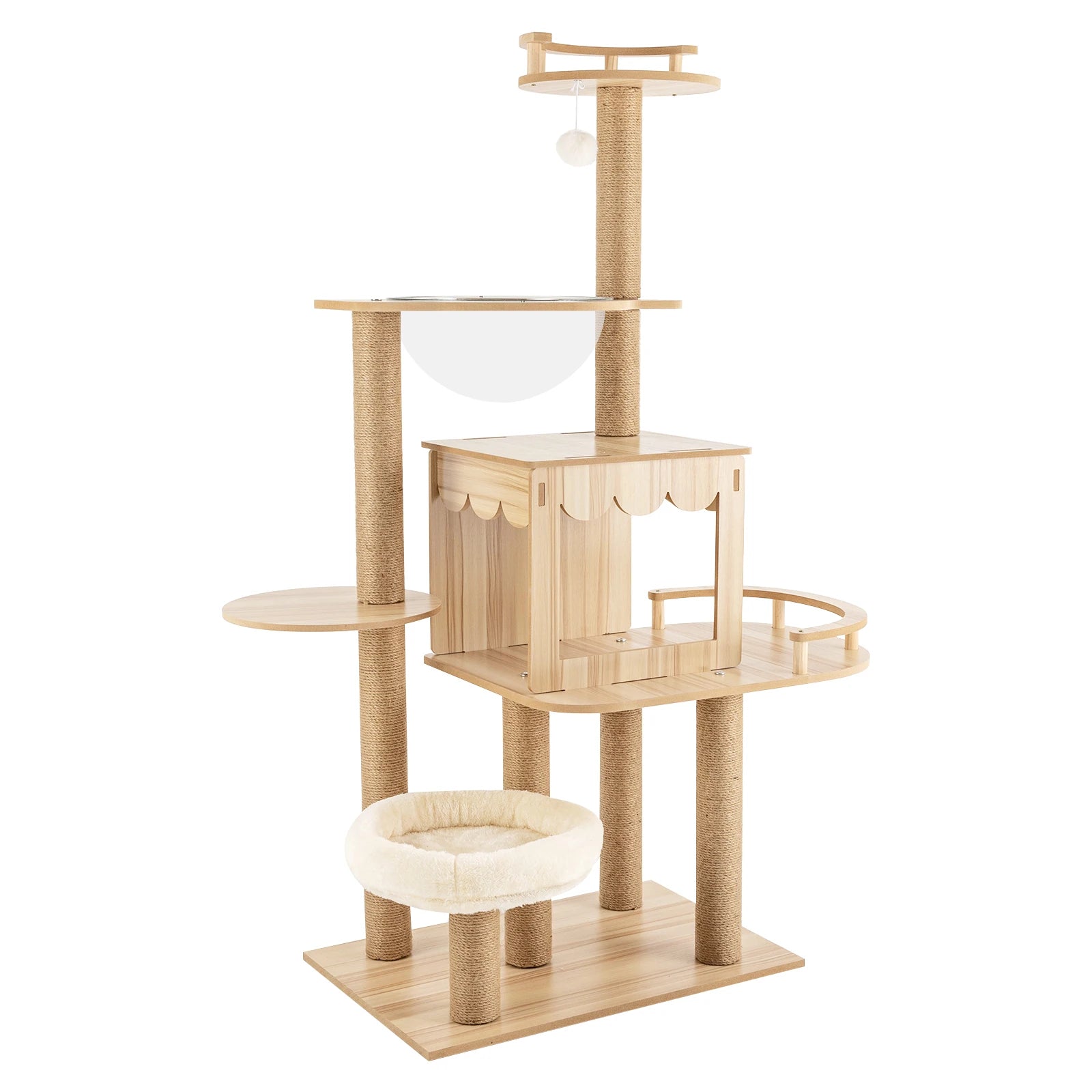 Choose this wood cat tree tower to bring your cat a comfortable and pleasant place to play and a warm and comfortable place to rest. Whether your kitten wants to stretch out in a spacious cat house, curl up in a plush litter mat, or release the urge to scratch on a twine post, this all-in-one cat tree tower combines style and function to make your fur baby's day fun and exciting!