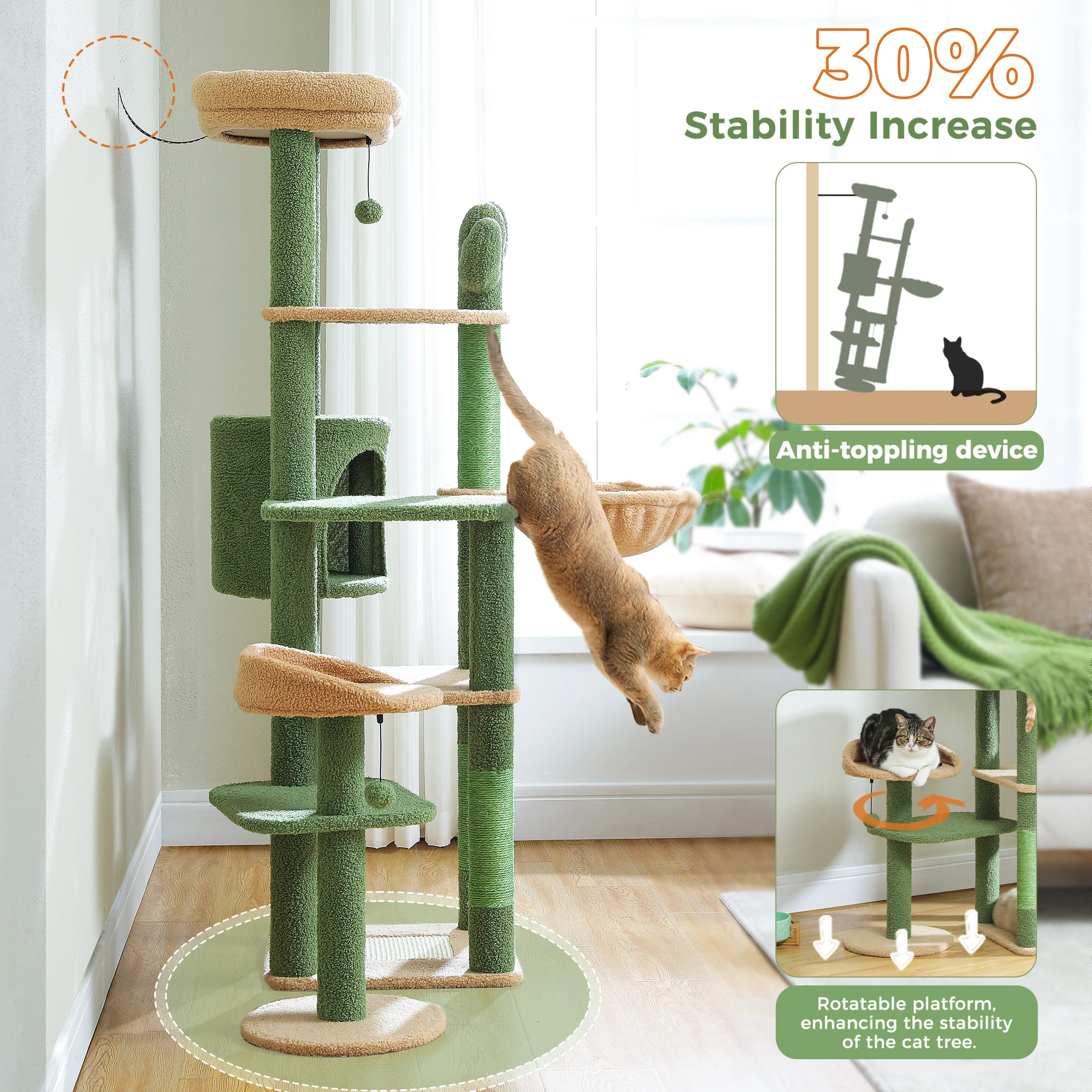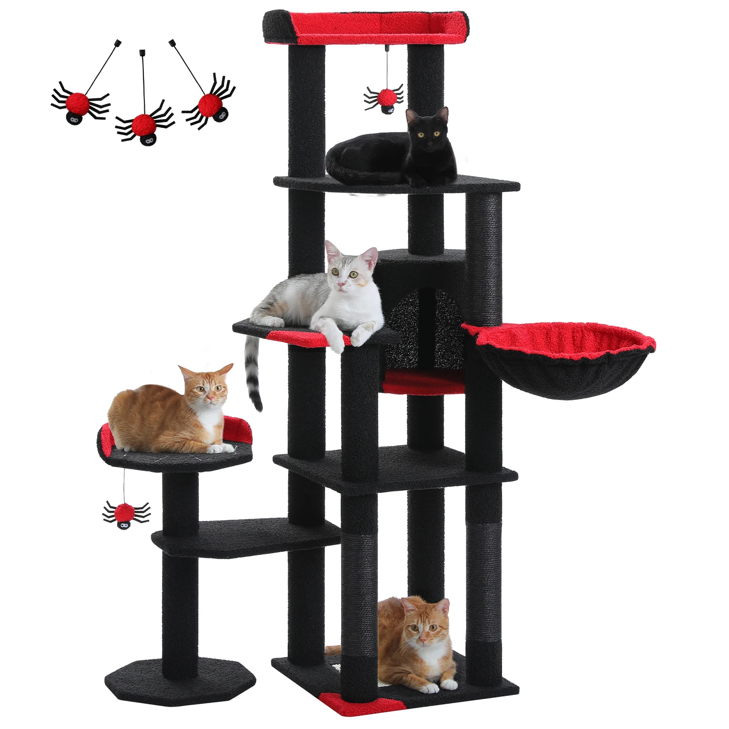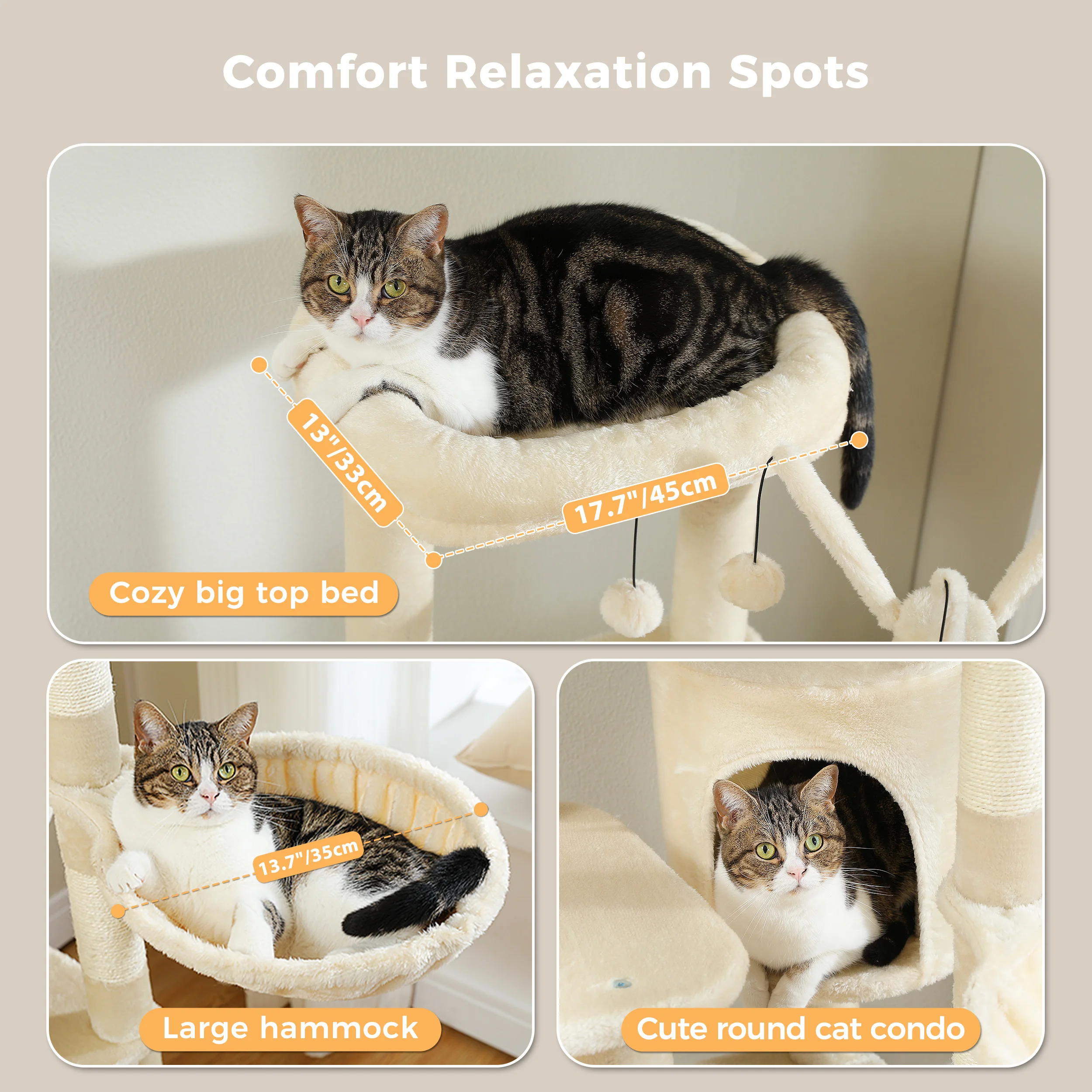 [Multi-layer to Relax]: This tall cat tree has large top perch, private condo,large hammock,sisal covered scratching post and fluffy pom pom ball for kittens, samll cats and average cats to rest and entertainment.Each level offers sufficient space for cats to play and climb, capable of accommodating 4-5 adult cats playing simultaneously.