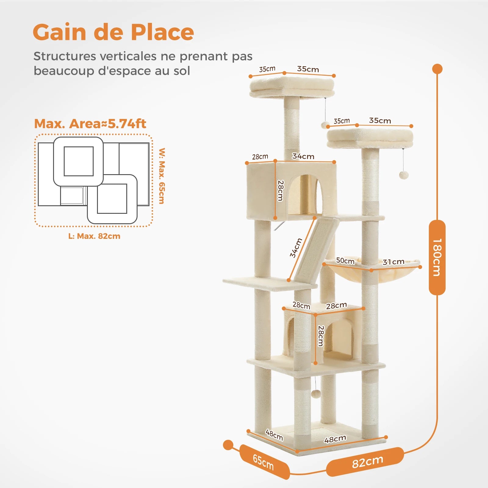 Multi-Level Cat Playground: Designed with multiple levels, this 180cm tall cat tower provides ample vertical space for your cats to explore and satisfy their natural instincts and activity needs. This cat tree features 6 scratching posts, 2 scratching boards, 2 pompoms, 2 condos, 1 hammock, and 2 perches, catering to the various needs of multiple cats simultaneously.