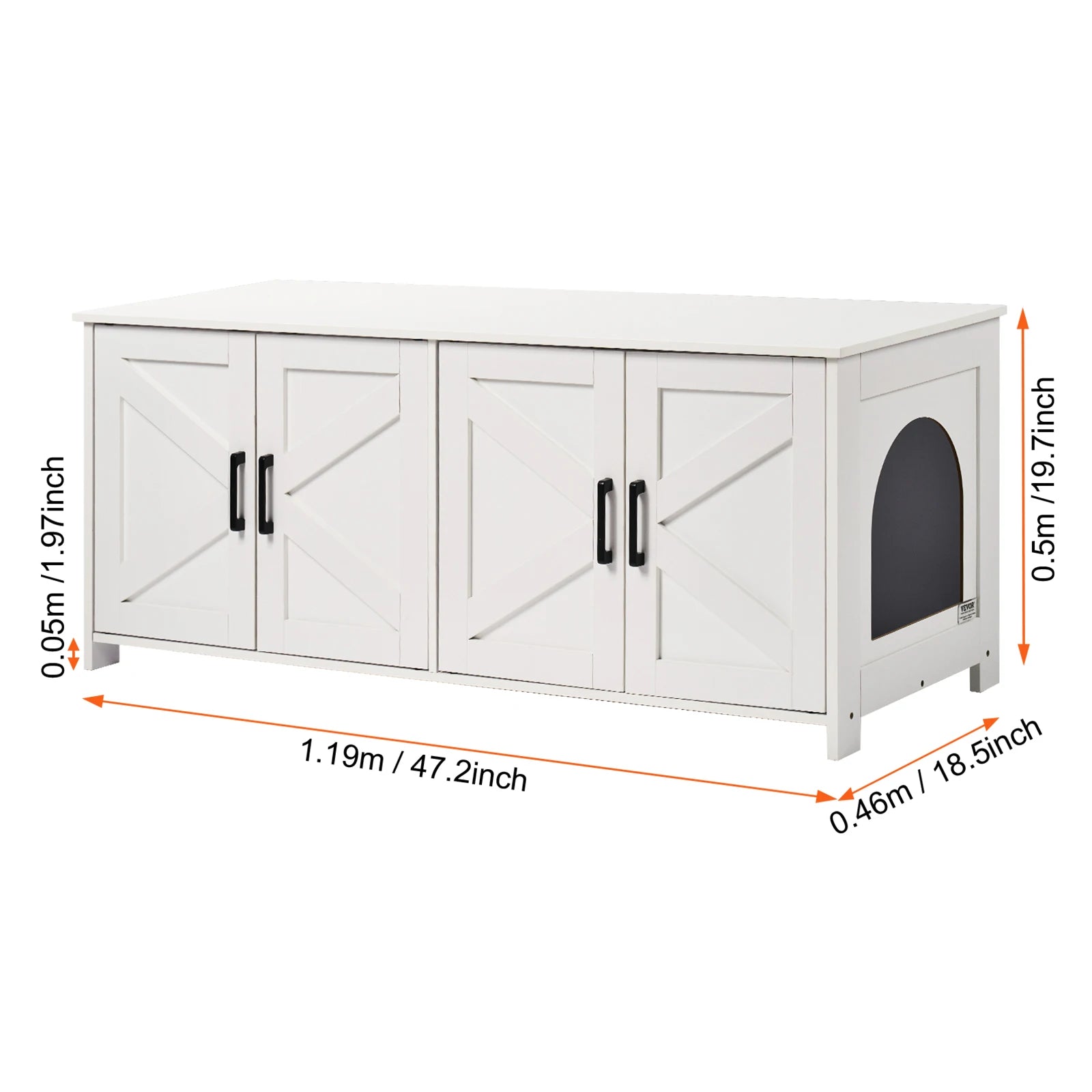 Spacious Space: Measuring 47.2x18.5x19.7in, this cat litter box furniture provides a comfortable and free resting space for pets. It can accommodate cat litter boxes with a length of less than 21" and a width of less than 17.7". It is equipped with 4 doors and 2 windows for cats' easy access freely.