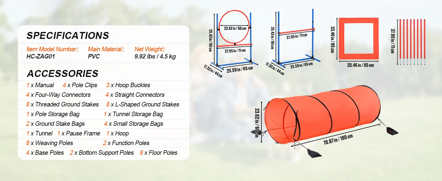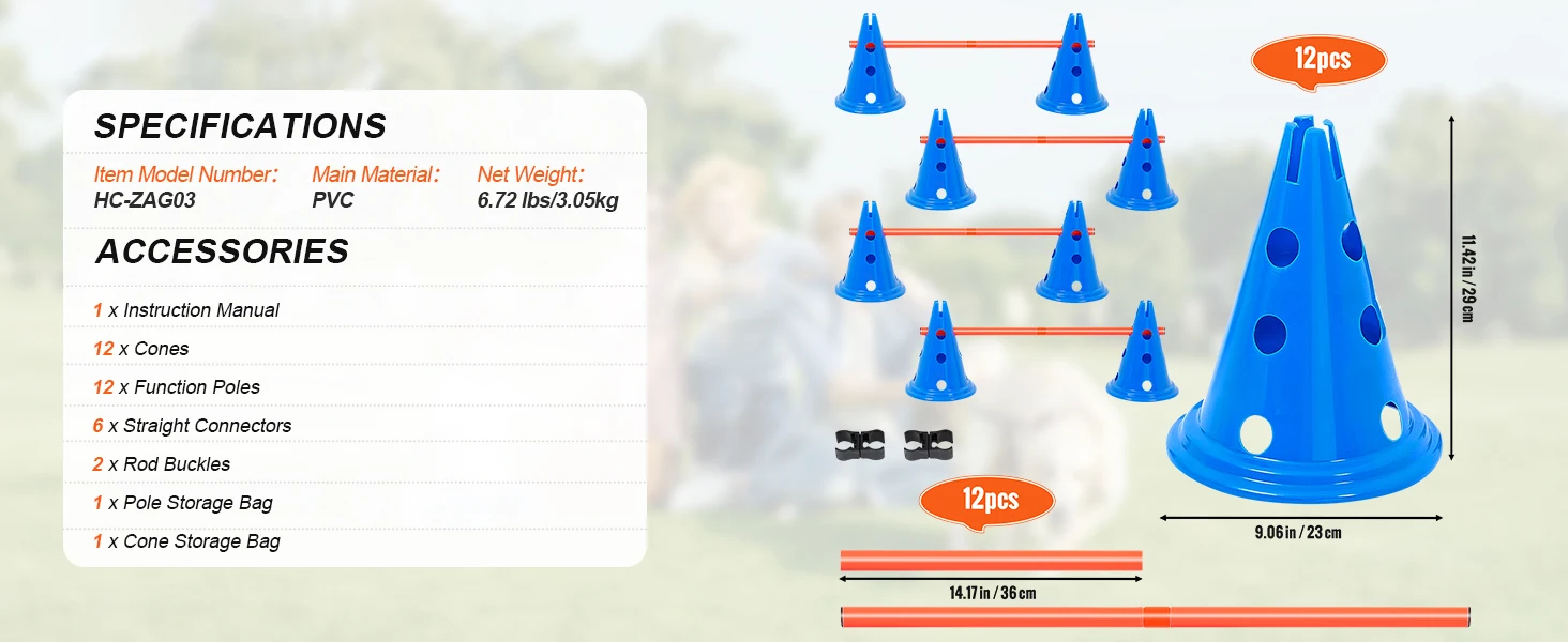 What’s Included: Instruction manual x1; cone barrels x12; action rods x12; straight connectors x6; rod clips x2; pole storage bag x1; cone storage bag x1. Everything you need for a complete agility training setup, ready for immediate use and fun.