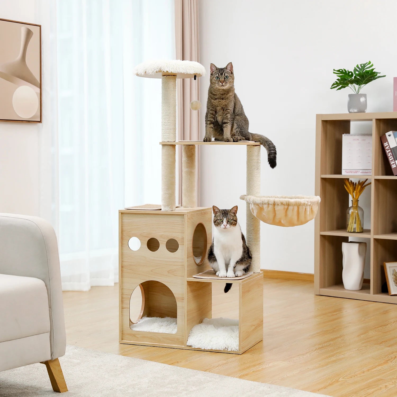 Wood Cat Tree with Sisal Scratching Posts, Large Top Perch, Deep Hammock, Cozy Cat Condo for Indoor, Multi-Level Cat Tower House